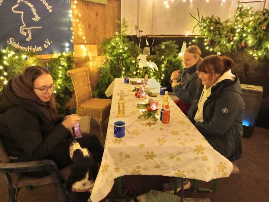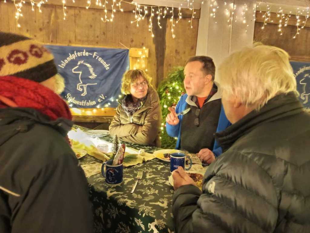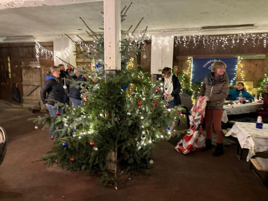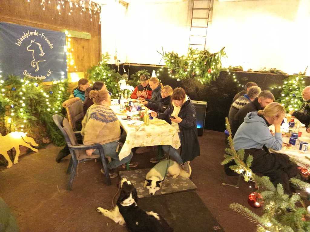 Mit viel Freude haben wir am Vortag die kleine Halle auf Gut Herbeck wieder schön feierlich mit Tannengrün, Lichterketten und Christbaumkugeln in Islandfarben geschmückt. Und pünktlich zum Beginn der Weihnachtsfeier duftete alles nach frischen Waffeln, Glühwein und heißem Punsch. Viele waren der Einladung gefolgt und ein herzliches Wiedersehen vermischte sich mit angeregten Gesprächen bis das Buffet eröffnet wurde und sich alle an den Köslichkeiten labten. Ein herzlicher Dank geht an dieser Stelle wieder an Stefan Düllmann für seine Kochkünste. Nachdem alle satt waren gab es die große Bescherung. Ulla hielt eine großen Sack mit den ganzen Wichtelgeschenken parat und jeder der mitwichteln wollte, konnte hier sein Glück versuchen. Auch die schönen Weihnachtstassen gab es wieder in neuer Kollektion. Ein wunderschöner Abend ging viel zu schnell zu Ende. Vielen Dank an Familie Düllmann und an alle, die zum Gelingen des Abends beigetragen haben!