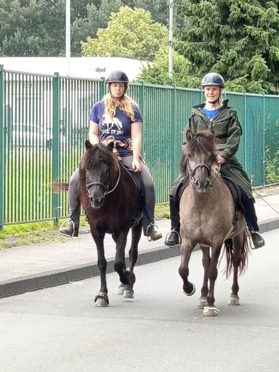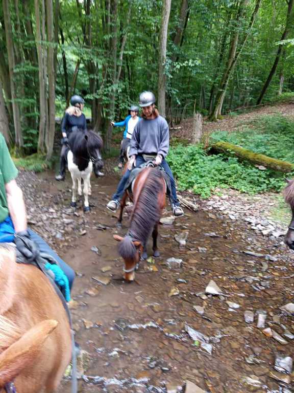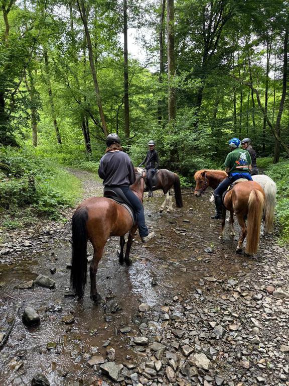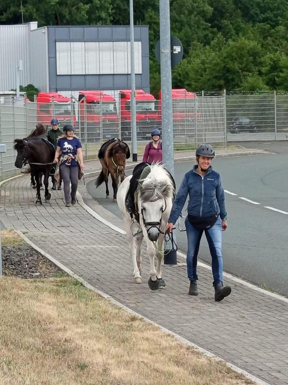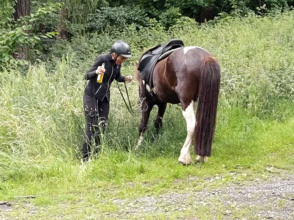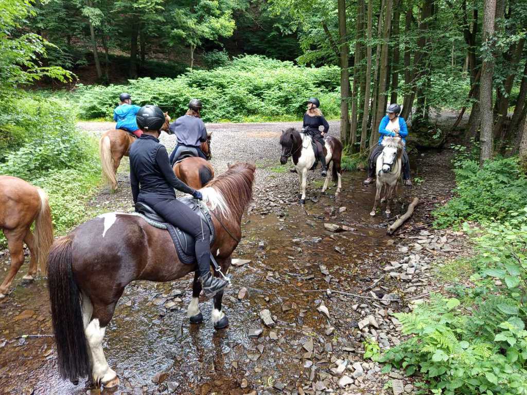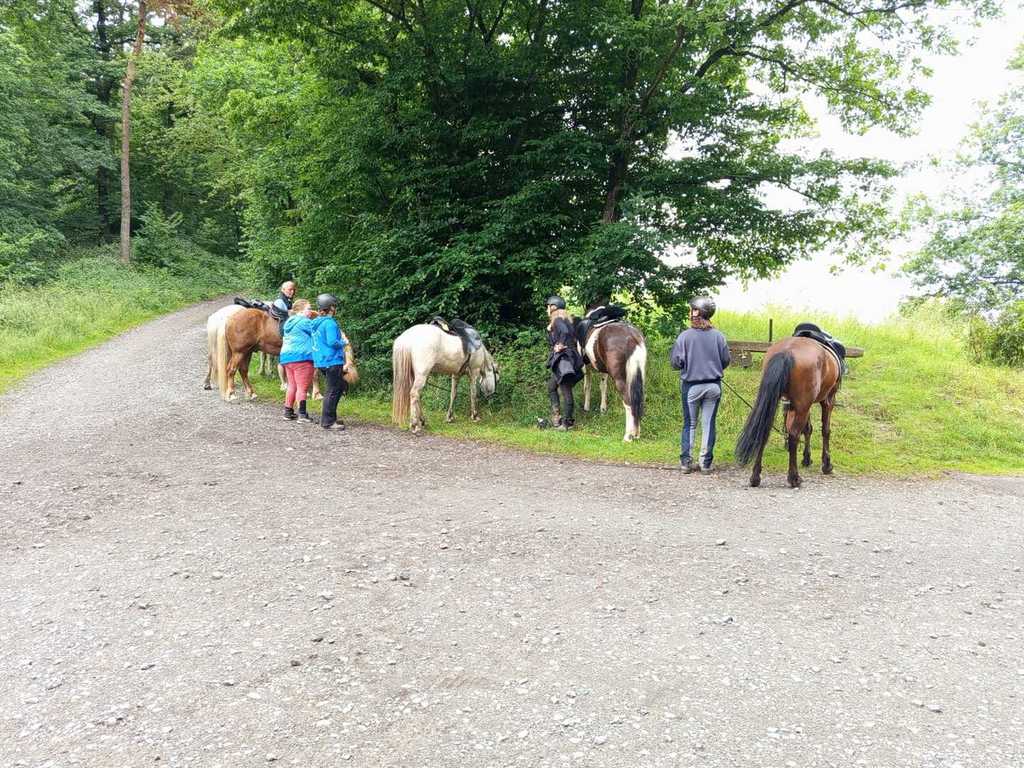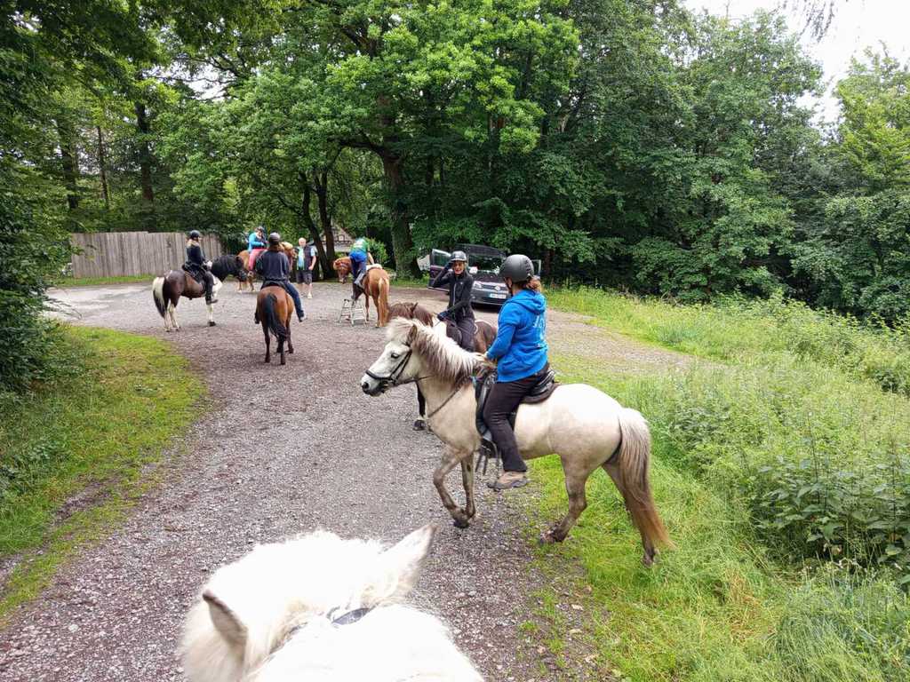 Der Tag versprach sommerlich zu werden. Nach ein paar Anreiseproblemen und einem guten Frühstück brachen wir dann endlich mit sechs Reitern auf. Der Weg führte znächst ins Tal und dort mussten wir auch schon das erste Mal durchs Wasser. Nachdem sich das ein oder andere Pferd zunächst geziert hatte nass zu werden, war die erste Schwierigkeit bald gemeistert und es ging munter weiter. Später des Weges lagen auch noch einige Bäume quer und wir mussten absteigen und eine Strecke führen. Durst brauchte eigentlich kein Pferd zu haben, weil wir immer wieder am Wasser waren und die Füße kühlen konnten. Zur Mittagspause überraschte uns Thomas mit Snacks und Getränken für Pferd und Reiter. Nun ging es zur Glörtalsperre weiter. Am ersten Sommertag des Jahres war die Talsperre natürlich ein beliebtes Ausflugsziel für Badegäste. Trotzdem fanden wir noch ein Plätzchen, um unseren Pferden ebenfalls einen kleinen Badespaß zu gönnen. Danach ging es noch durch eine wunderschöne Landschaft mit tollen Wegen nach Radevormwald und obwohl es so schön war, waren wir offensichtlich allein unterwegs. Angekommen in Borbeck, waren doch alle froh, endlich angekommen zu sein und das Ziel erreicht zu haben! Vielen Dank an Tina für die Organisation, an das Team Borbeck und Thomas für die Versorgung !